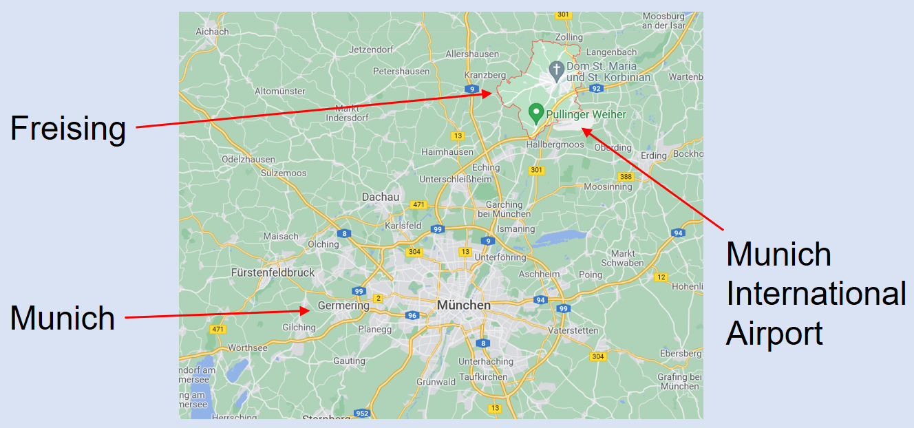 Freising is a 15min/25€ Taxi ride from Munich airport.